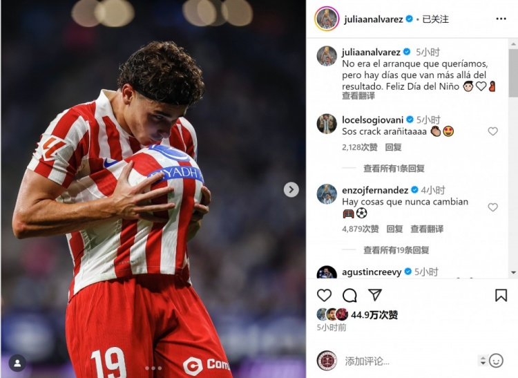 8月18日讯 西甲首轮比赛,阿尔瓦雷斯任意球破门,马竞客场1-2不敌西班牙人,阿尔瓦雷斯社媒晒出庆祝进球的照片,配文:“这不是我们想要的开局,但有一些日子超越了比赛结果,儿童节快乐!”注:阿根廷儿童节为8月的第三个周日,今年是8月17日...