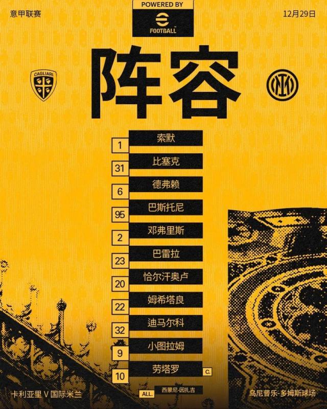 意甲第18轮,国际米兰客场对阵卡利亚里。上半场双方互交白卷,下半场巴斯托尼头球吊门,劳塔罗打破进球荒,恰尔汗奥卢点球命中,最终国米客场3比0战胜卡利亚里,完美告别2024。